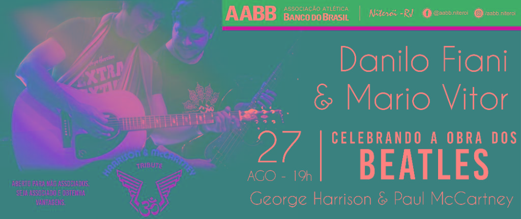A AABB NITERÓI Orgulhosamente Apresenta: “Tributo aos Beatles : George Harrison & Paul McCartney” com Harrison & McCartney Tribute. O tributo acontecerá na sede de São Francisco, na Sexta Feira, Dia 27 de agosto a partir das 19h.
