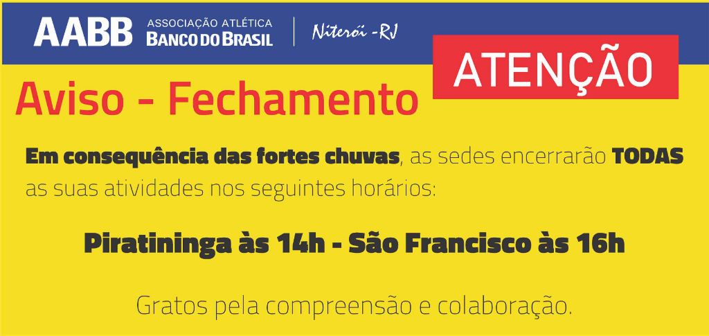 Prezados associados e convidados. Devido às fortes e constantes chuvas das últimas horas em Niterói, encerraremos HOJE as nossas atividades às 14h em Piratininga e às 16h em São Francisco. Para que nossos funcionários cheguem com segurança em suas casas. Gratos pela compreensão.
