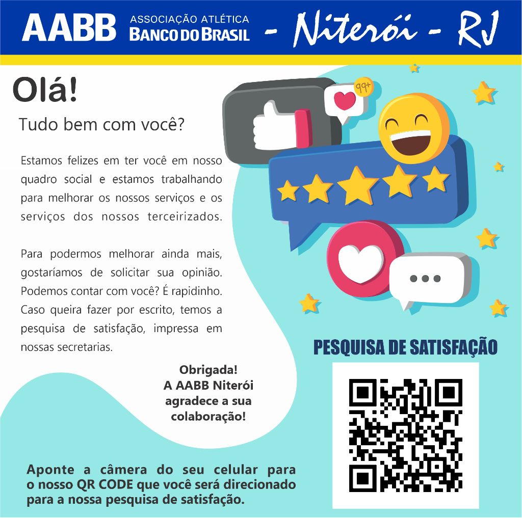 Estamos iniciando uma Pesquisa de Satisfação. Entre os dias 18 e 31/05/2023, todos os associados poderão emitir suas opiniões sobre a AABB Niterói.